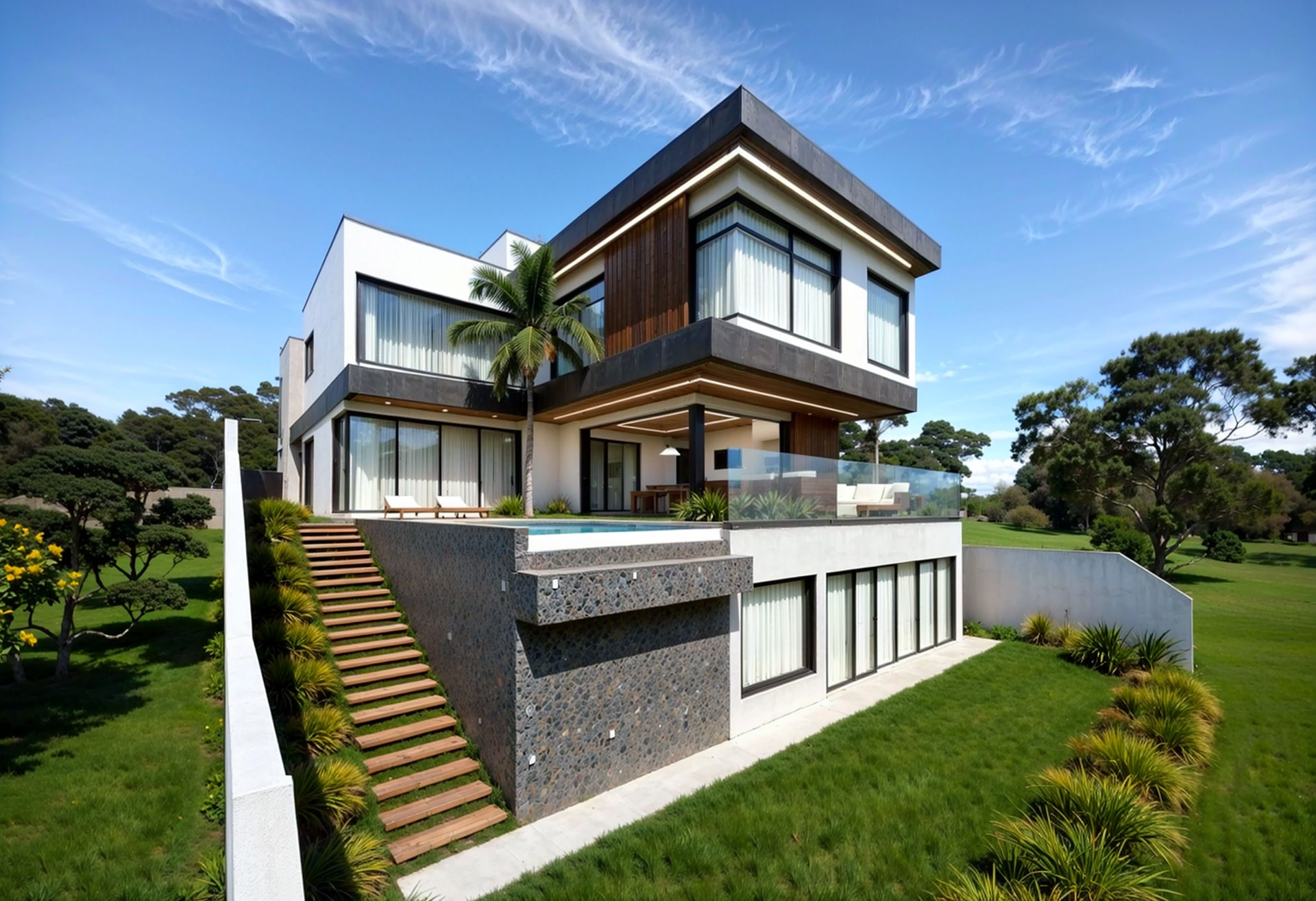 Residência Alphaville O.N., implantada em um terreno de 606 m², com 272 m² de área construída, é um projeto de arquitetura contemporânea marcado por volumetria flutuante e grandes vãos livres, soluções que conferem leveza visual e imponência, ao mesmo tempo em que exigem alto nível de precisão técnica e estrutural.