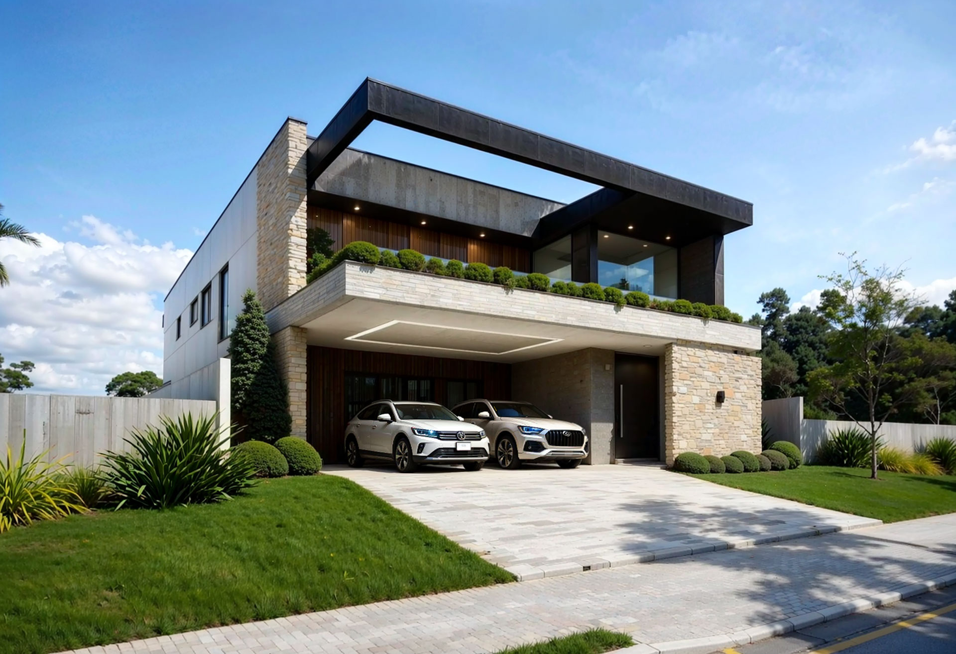 O grande diferencial desta obra está na integração total entre arquitetura e engenharia. Cada traço foi desenvolvido já considerando sua viabilidade construtiva, eliminando riscos comuns de projetos que se tornam inviáveis ou excessivamente onerosos durante a execução. A fachada em balanço foi cuidadosamente calculada para gerar impacto visual sem a necessidade de pilares obstrutivos, enquanto a garagem ampla mantém total liberdade estrutural e funcional.