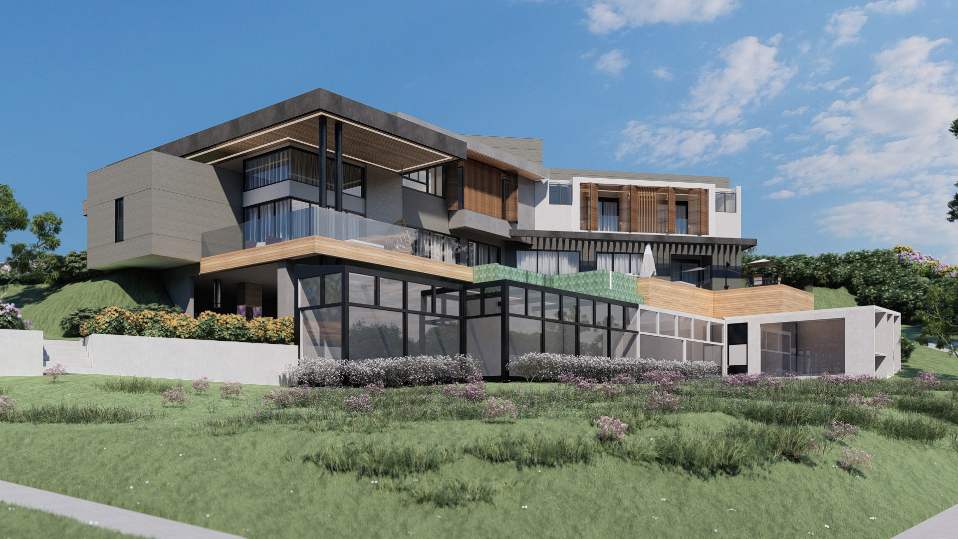 Este projeto no Vale dos Lagos nasce da oportunidade de trabalhar em um terreno amplo, com vistas privilegiadas e forte conexão com a natureza. A residência foi desenvolvida com uma composição arquitetônica imponente, marcada por volumes bem definidos, materiais contemporâneos e uma integração sofisticada entre os espaços internos e externos.