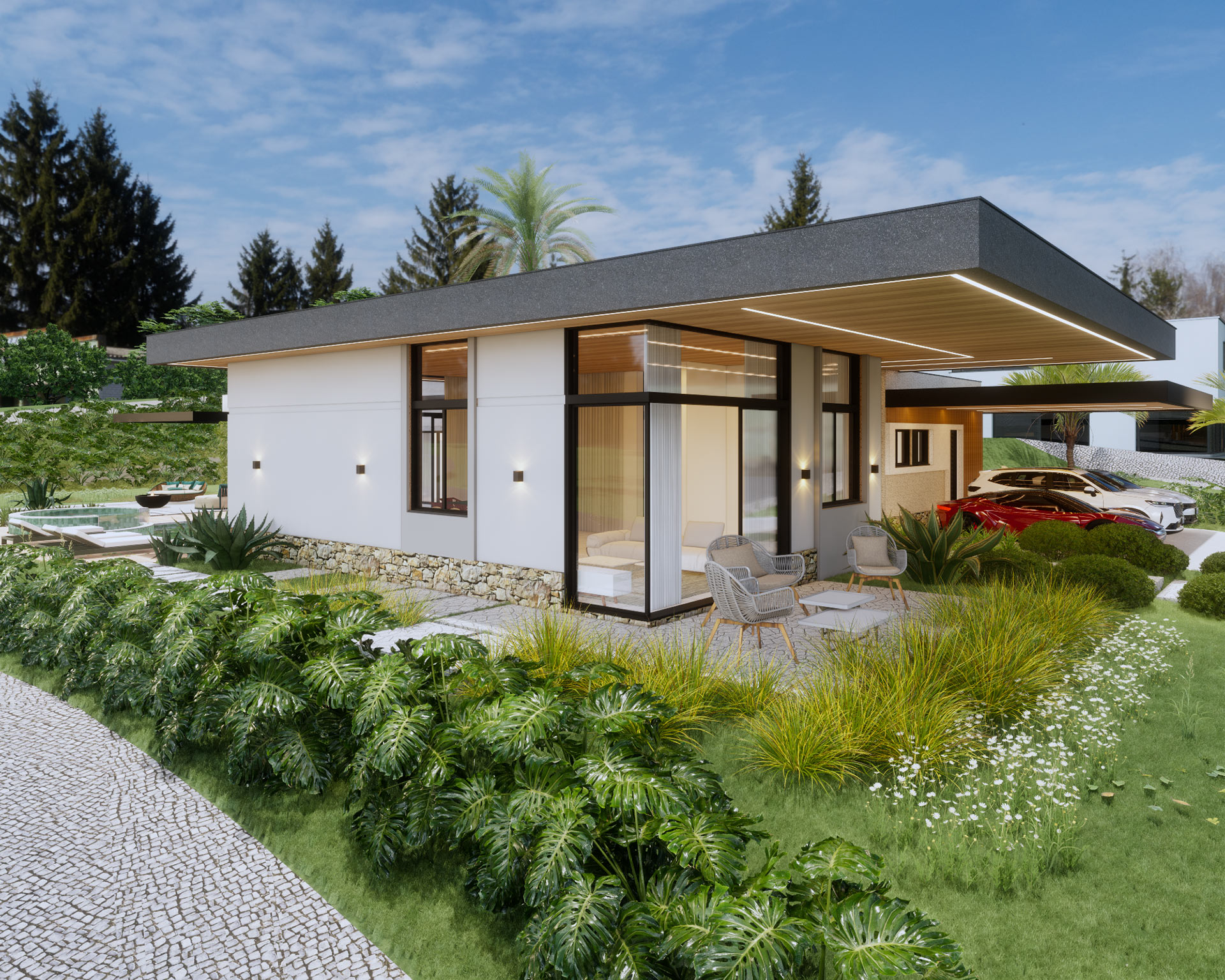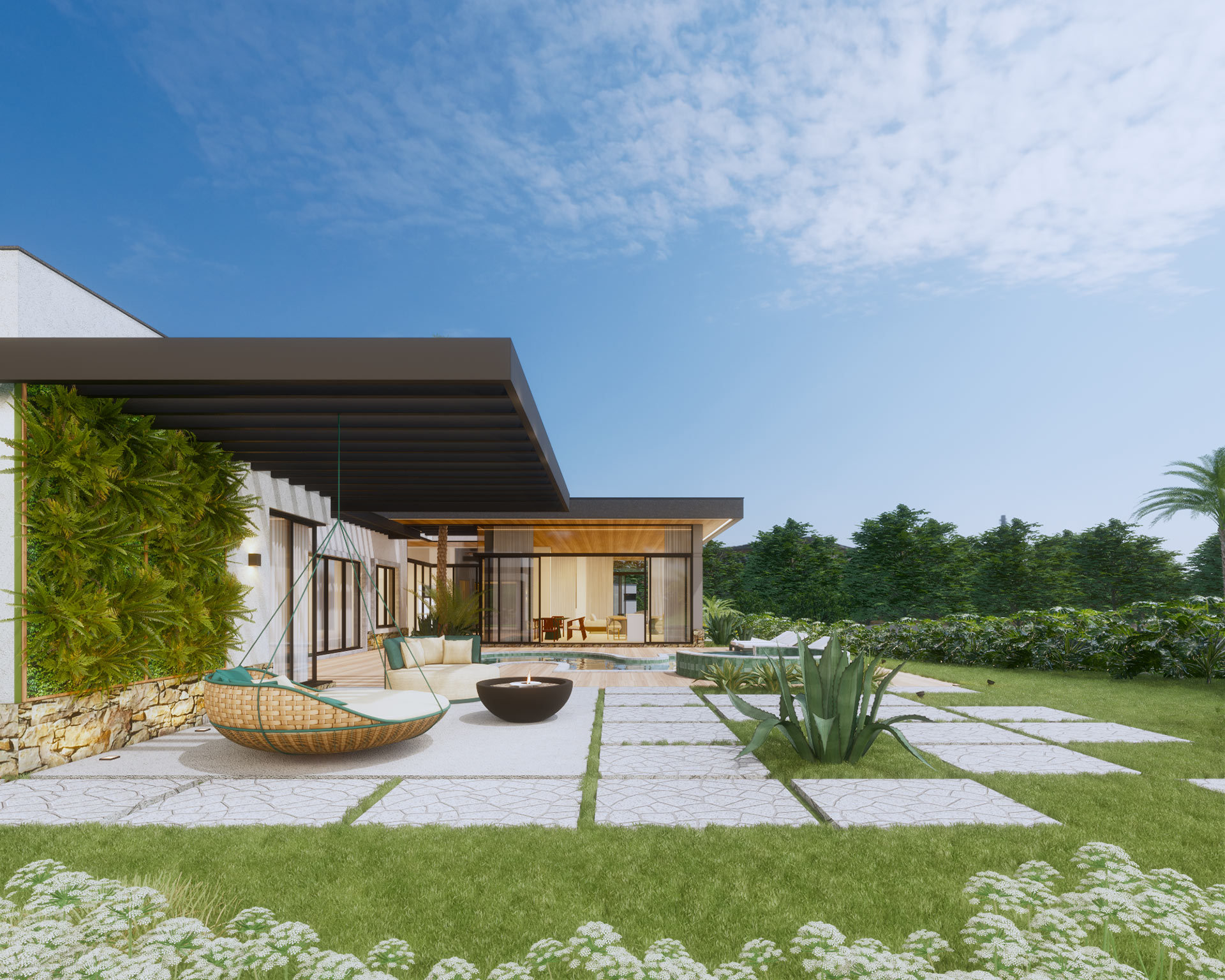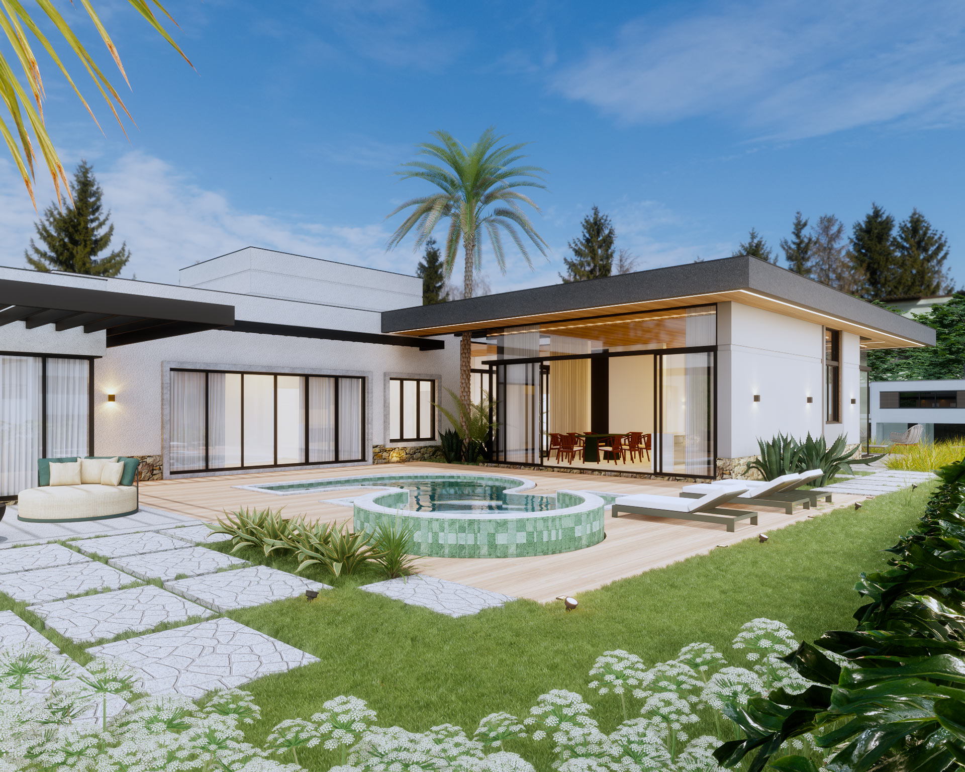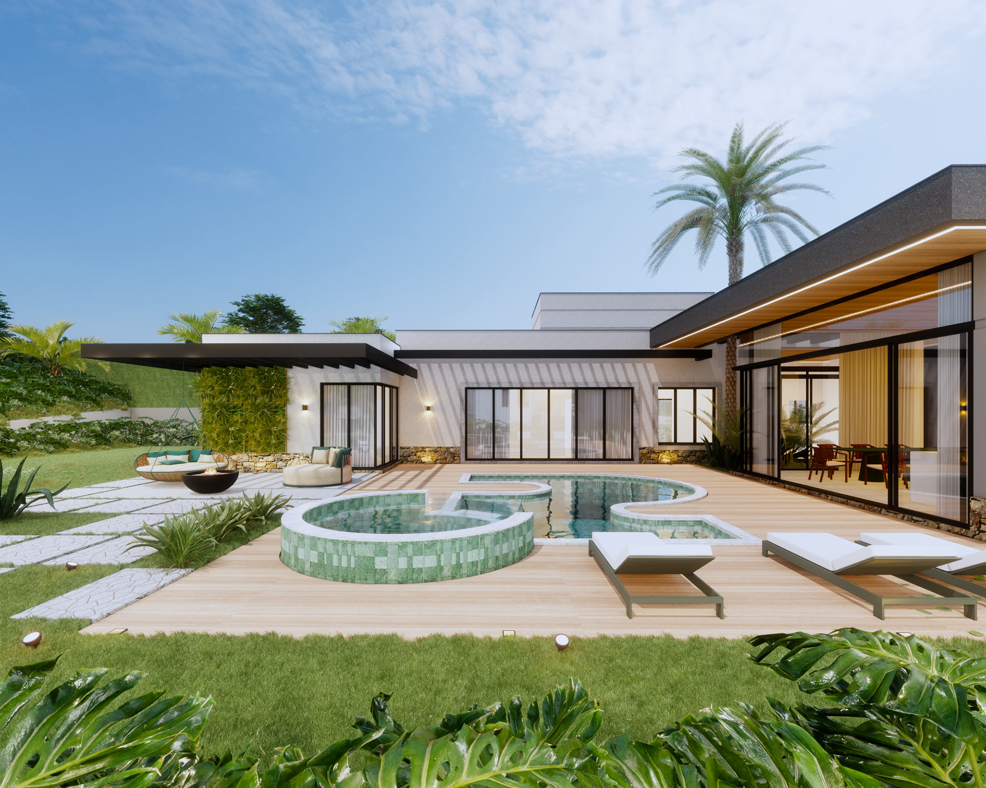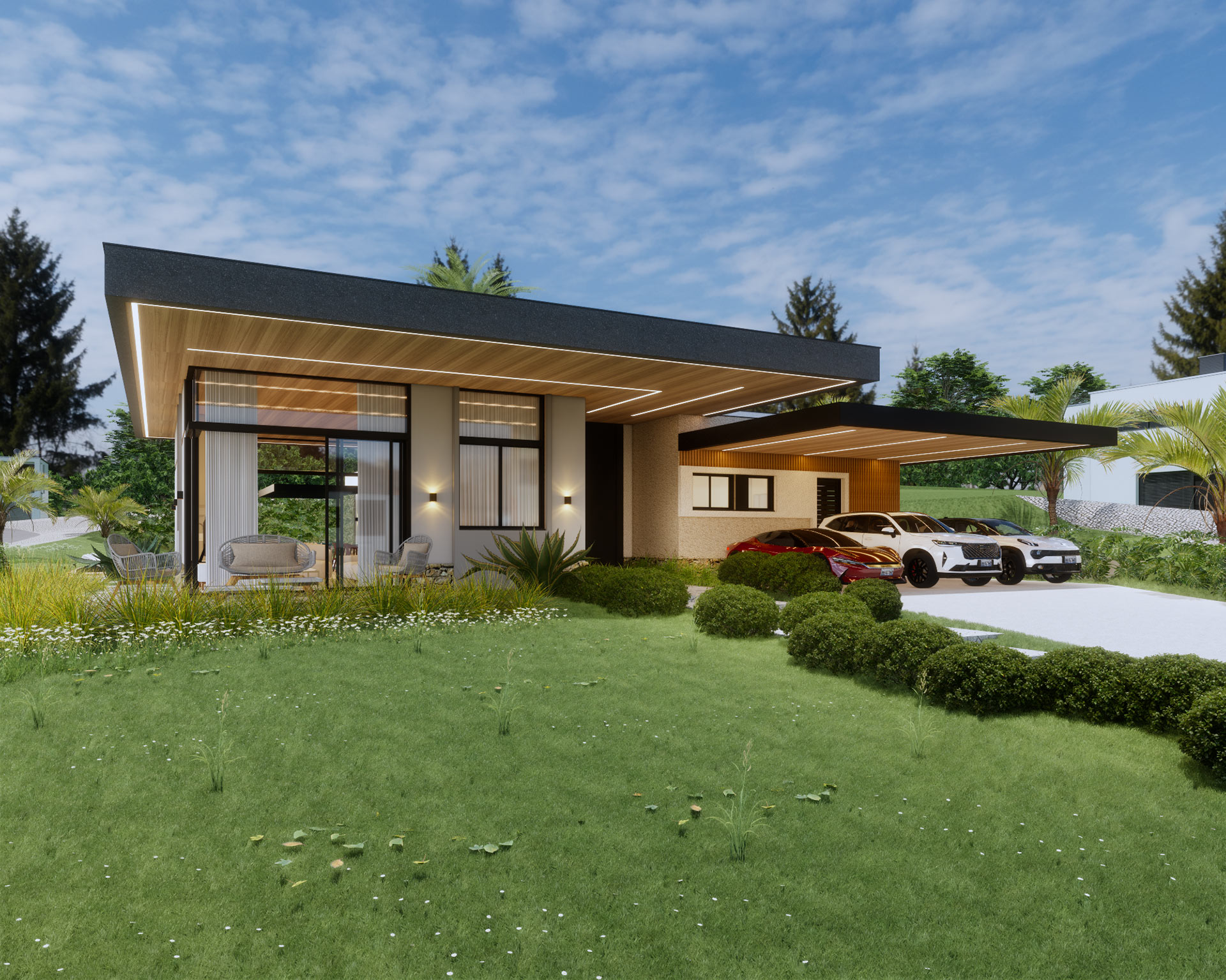 Esta residência térrea no Colinas do Parahyba foi projetada para oferecer amplitude, conforto e integração total com o entorno. O telhado em balanço, a fachada leve e os grandes planos envidraçados criam uma estética contemporânea acolhedora, valorizando a iluminação natural e tornando cada ambiente mais fluido e convidativo.