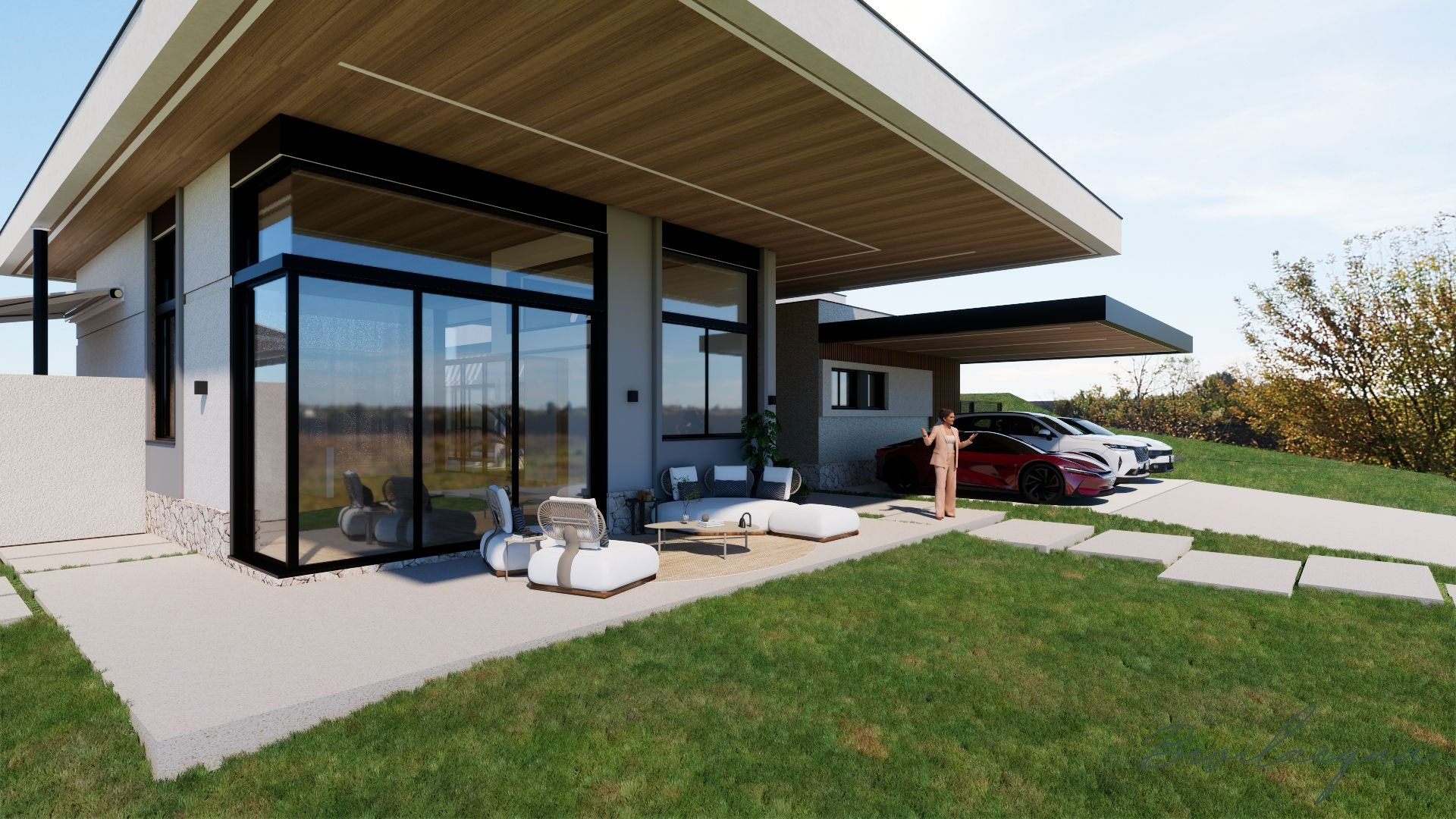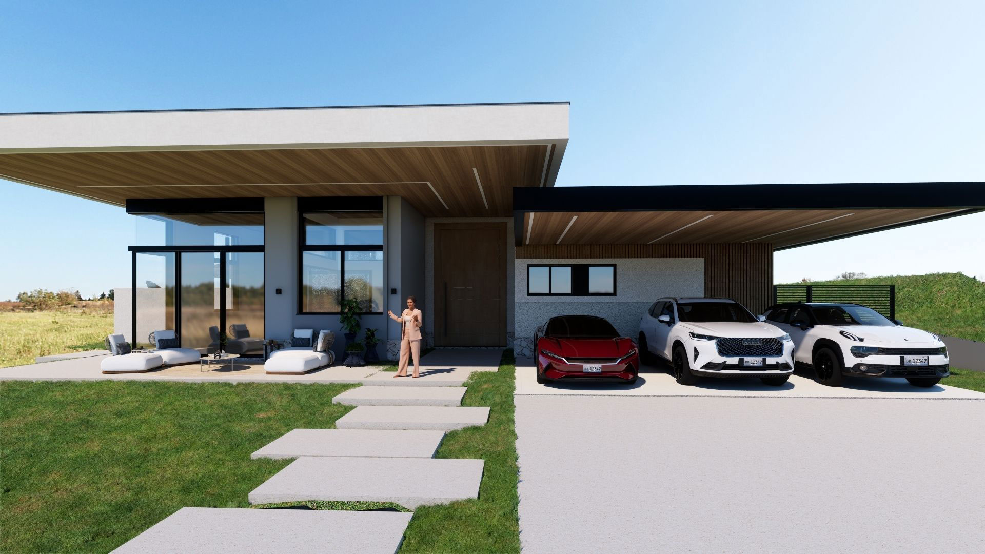 A proposta arquitetônica valoriza a praticidade da planta térrea, garantindo circulação confortável, iluminação natural abundante e conexão direta entre os ambientes sociais e o jardim. O terreno amplo favorece recuos generosos, privacidade e uma relação equilibrada entre construção e paisagem.