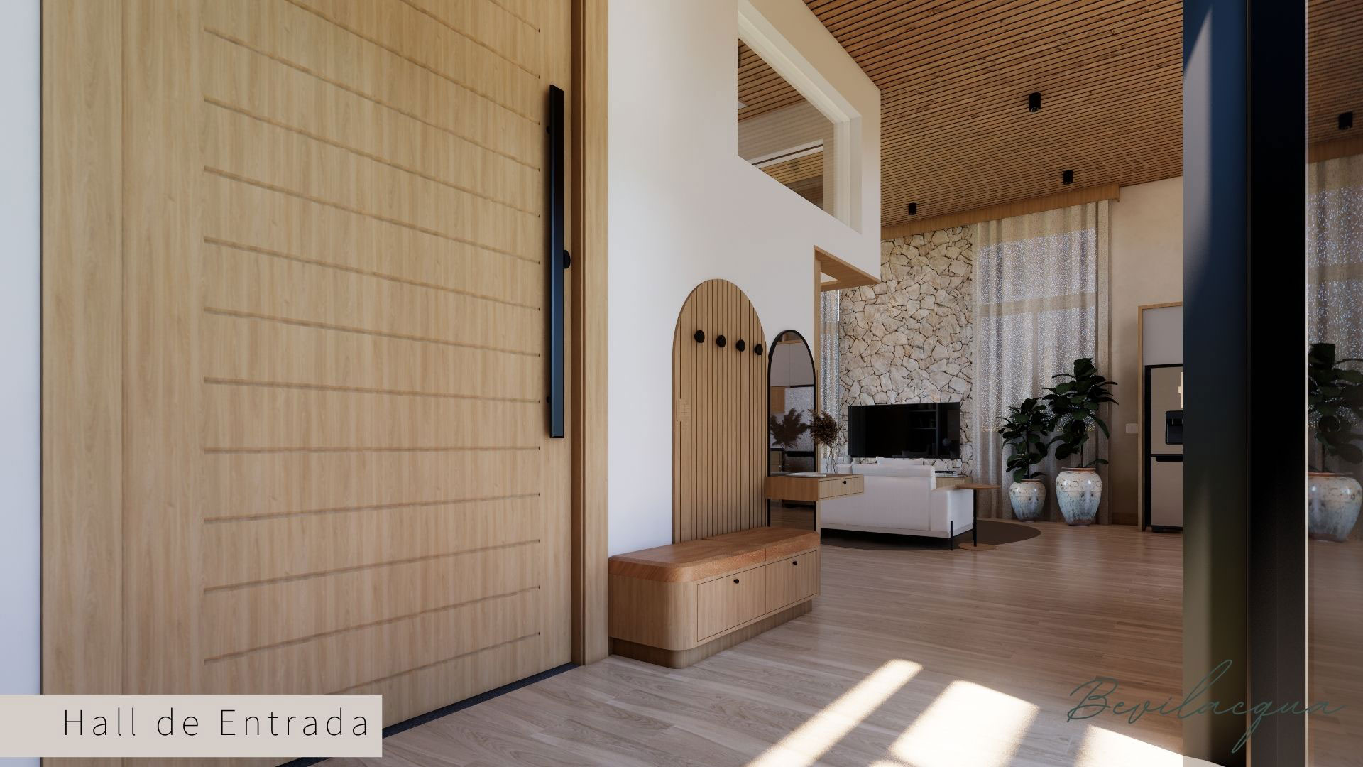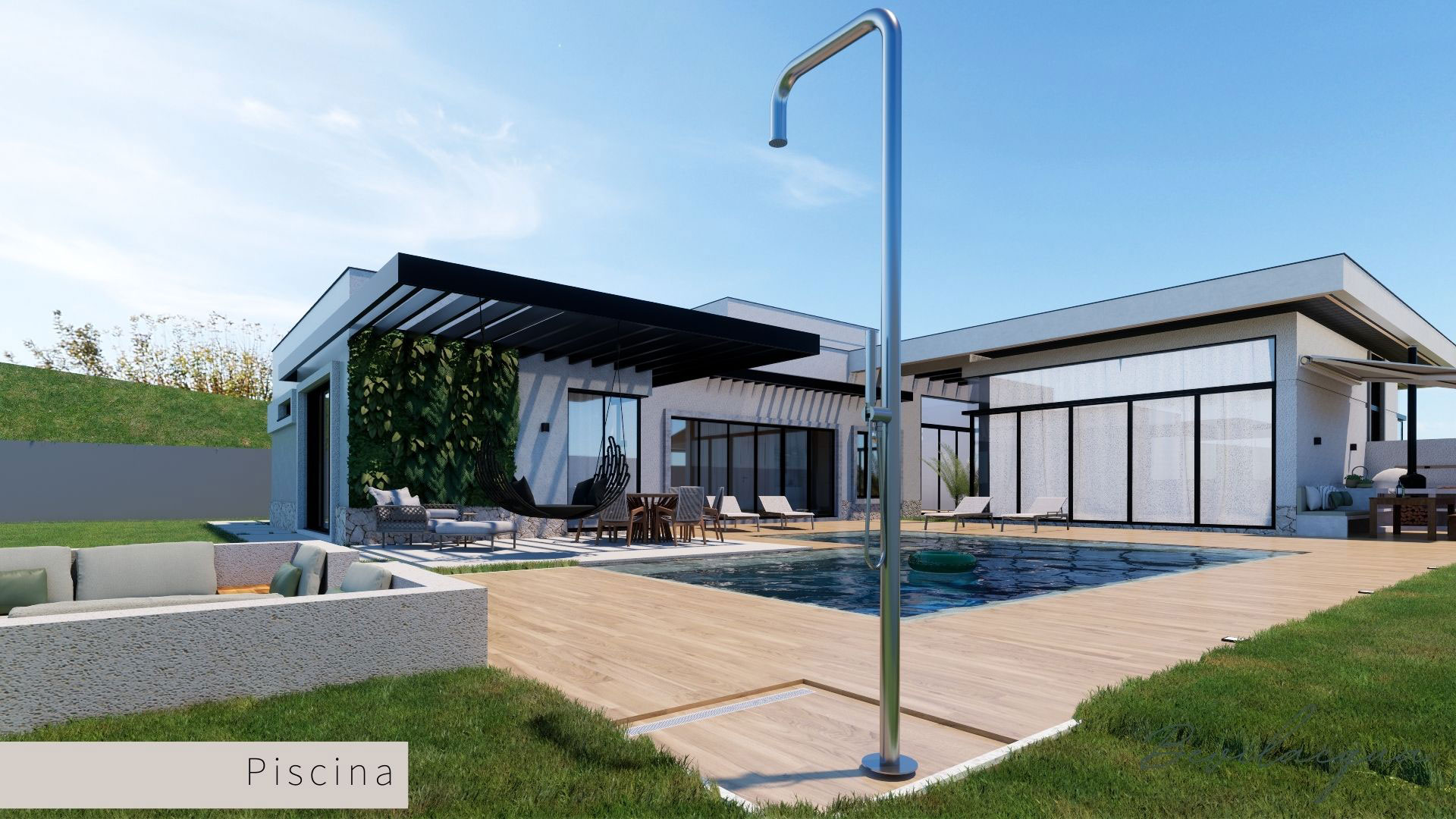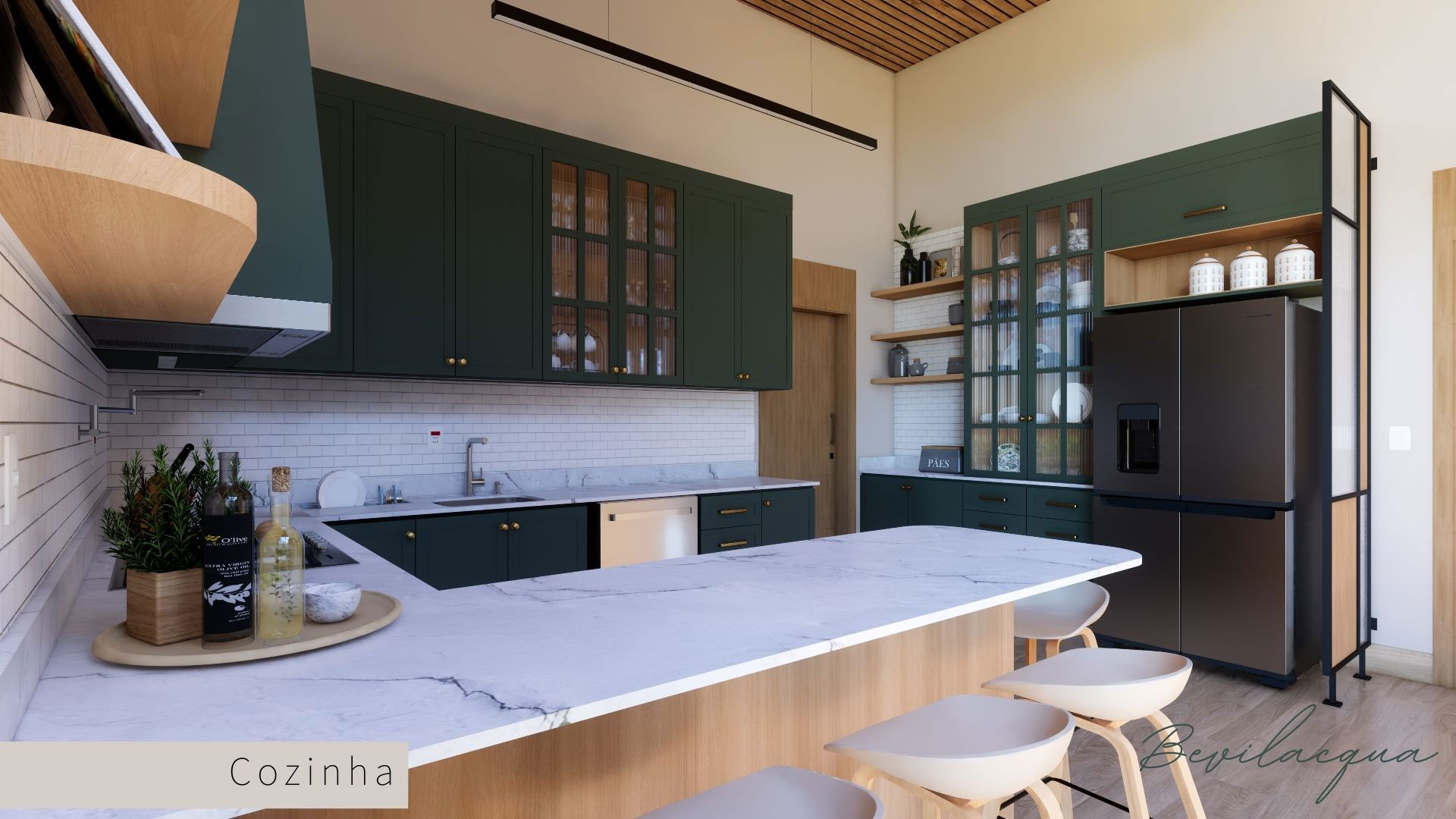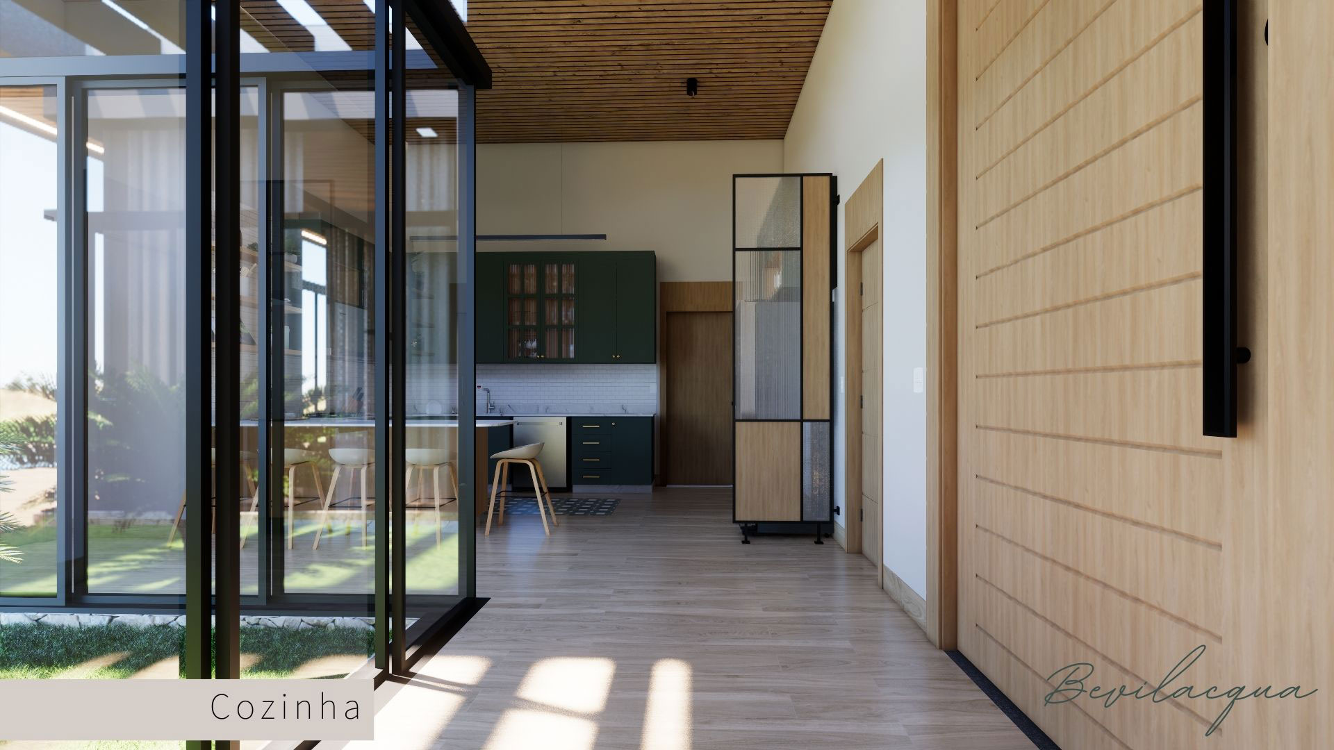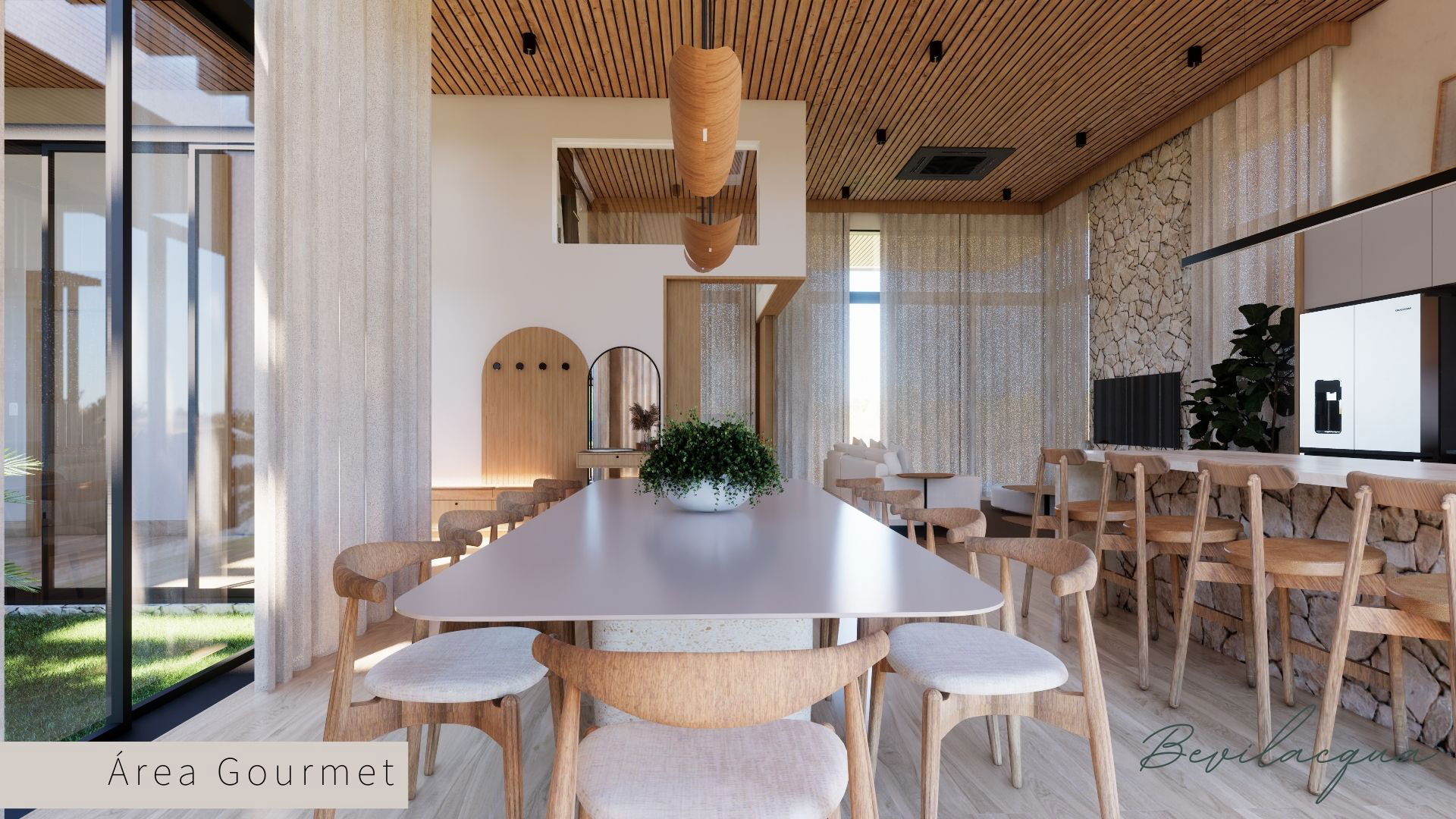 Projeto de Nadia e Elianai – uma residência térrea implantada em um terreno amplo, que permitiu explorar uma implantação estratégica e uma distribuição inteligente dos ambientes. A generosidade do lote possibilitou criar uma casa horizontal, com fluidez entre os espaços e forte integração com a área externa.