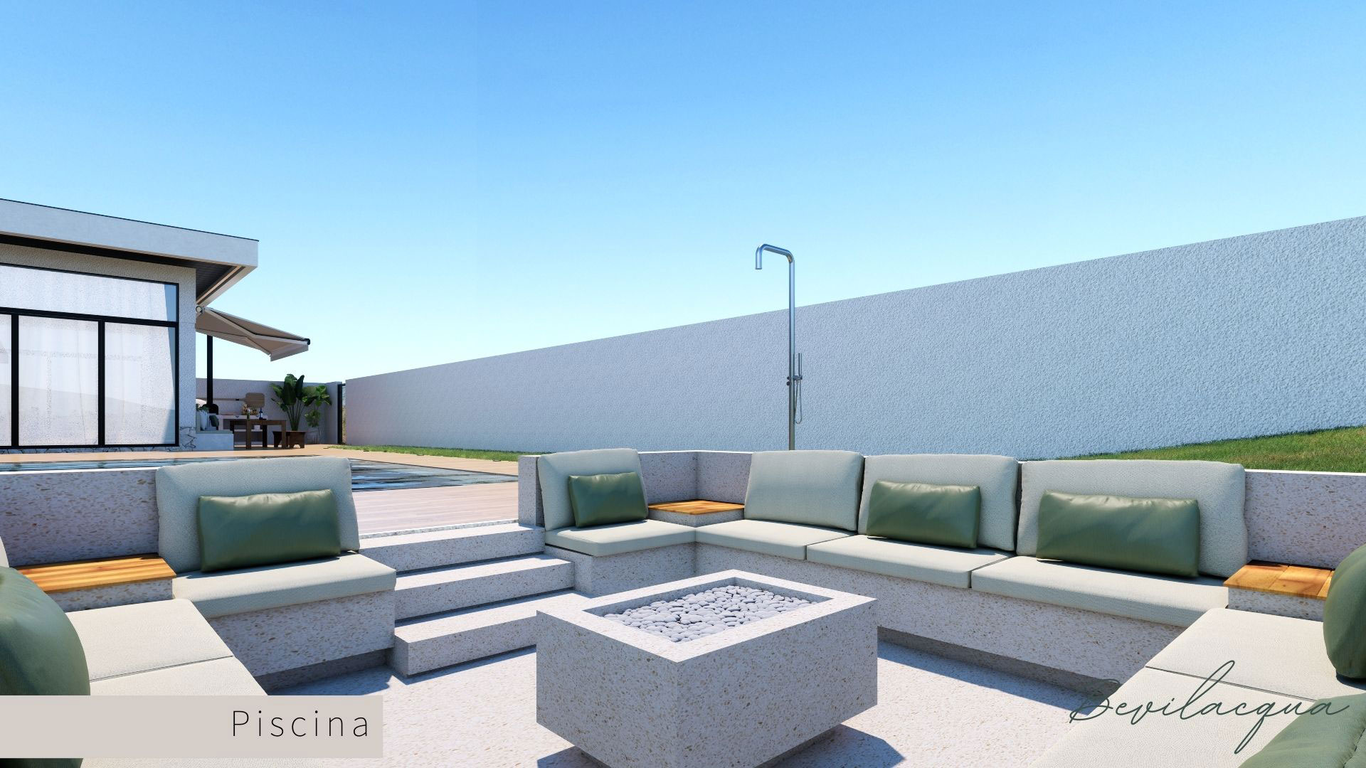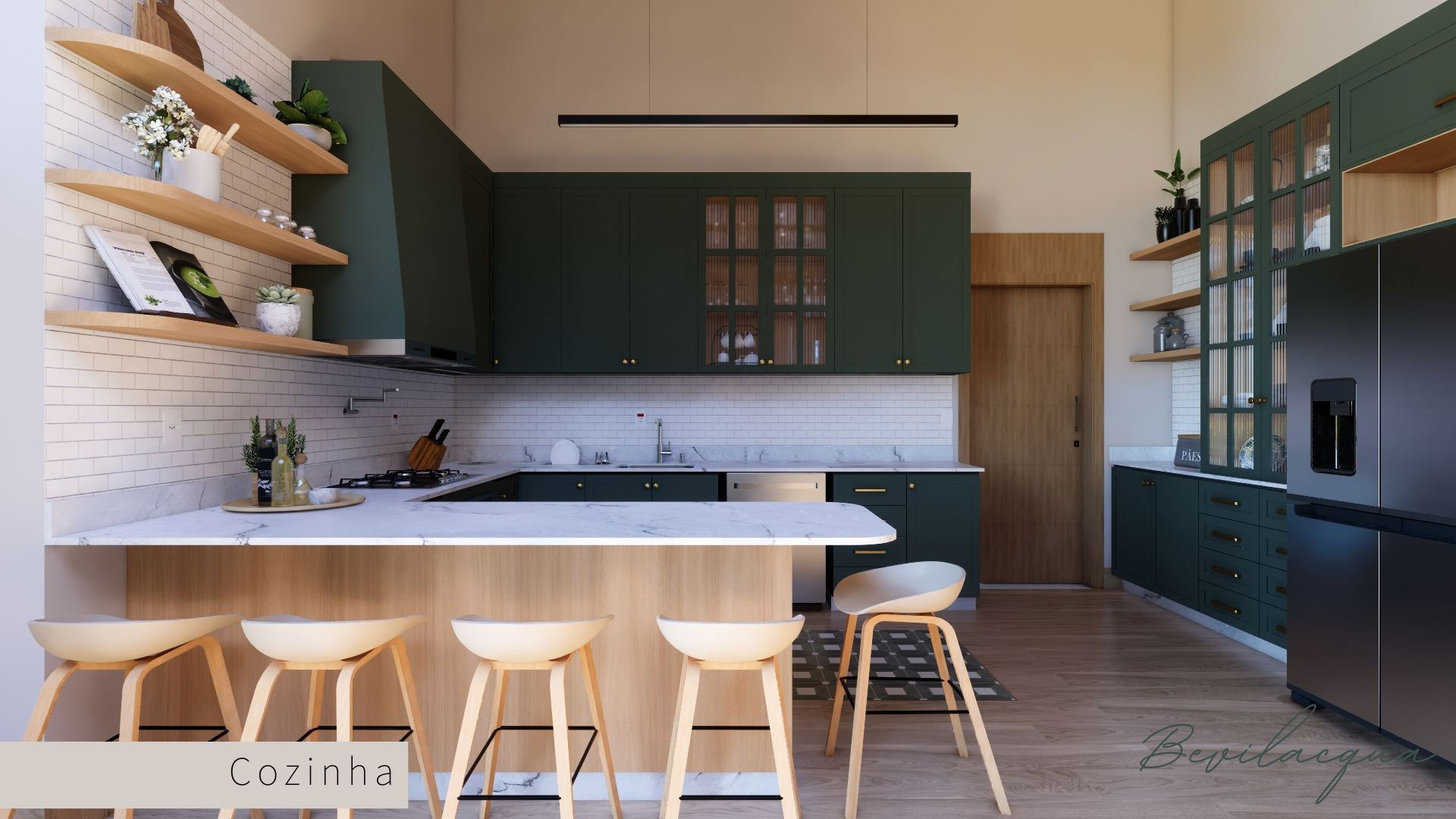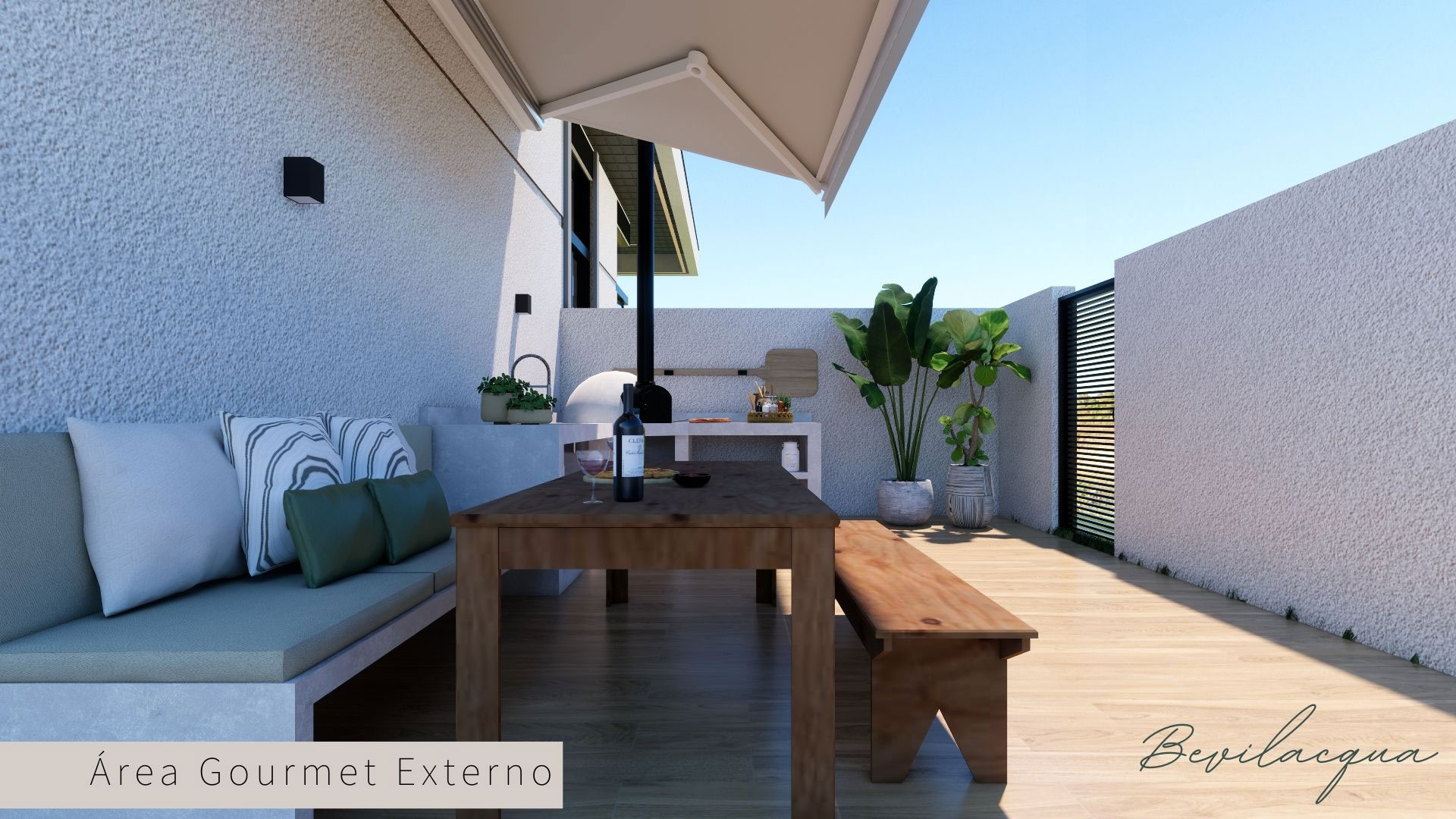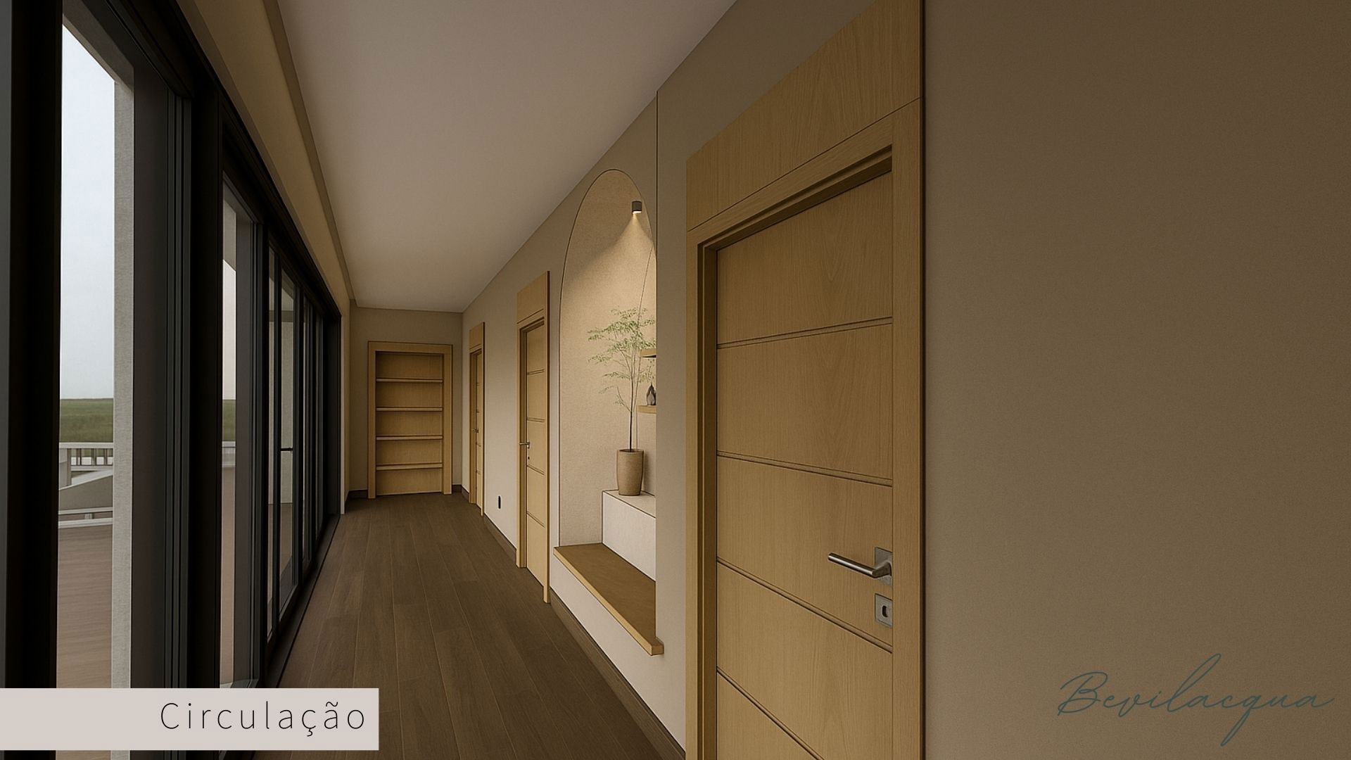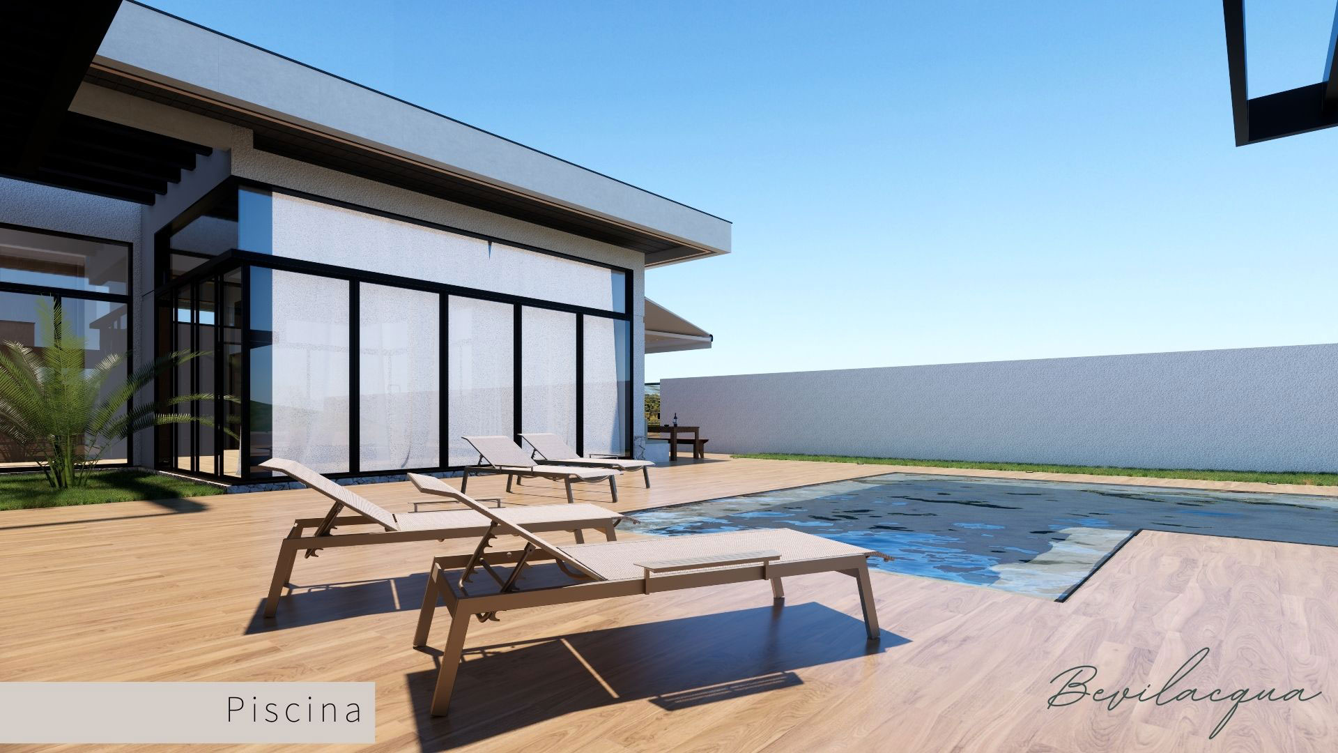 Projeto de Nadia e Elianai – uma residência térrea implantada em um terreno amplo, que permitiu explorar uma implantação estratégica e uma distribuição inteligente dos ambientes. A generosidade do lote possibilitou criar uma casa horizontal, com fluidez entre os espaços e forte integração com a área externa.